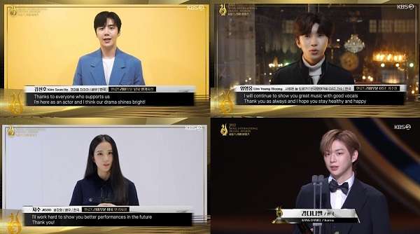 Penyanyi Lim Young Woong (OST “Love Always Run Away” dari KBS 2TV ‘Young Lady and Gentleman’) berterima kasih kepada tim produksi drama, aktor, dan fandomnya Young Woong Generation karena telah mendapatkan ‘Outstanding Korean OST’, dia berkomentar, “Saya akan terus tunjukkan musik yang bagus dengan vokal yang bagus. Terima kasih seperti biasa dan saya harap kalian tetap sehat dan bahagia.”